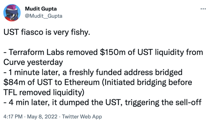 Terra a été dans le collimateur de plusieurs chercheurs qui ont alimenté la peur, l’incertitude et le doute concernant Luna et sa viabilité. Le 8 mai, le chercheur de l’industrie Mudit Gupta a tweeté les mouvements symboliques entreprit par le token déclarant que “le fiasco de l’UST est très suspect“.