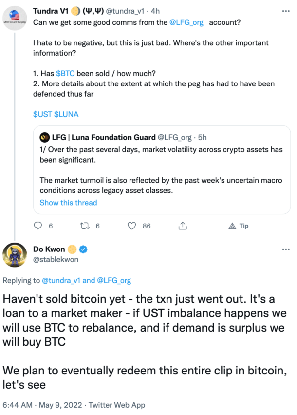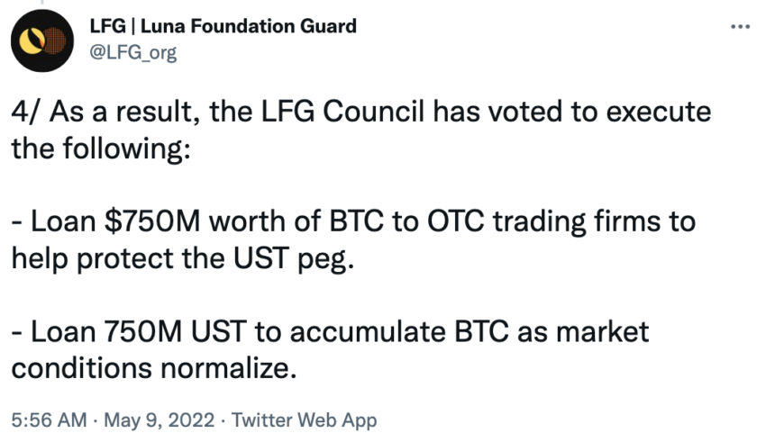 Le 9 mai, la Luna Foundation Guard a annoncé qu’elle préparait un prêt de 750 millions de dollars de bitcoins aux sociétés de trading OTC pour aider à protéger l’ancrage de l’UST.