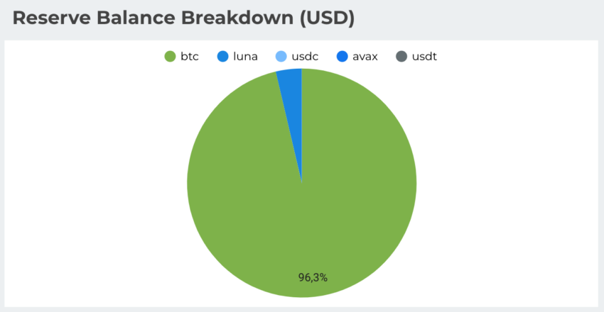 Terra a par ailleurs effectué des achats massifs de bitcoins et prévoit d’atteindre une réserve de 10 milliards de dollars de bitcoins pour disposer d’un soutien suffisant et ainsi veiller à la sécurité et à la liquidité de son stablecoin UST. Récemment, Terra a commencé à diversifier ses réserves dans d’autres actifs crypto, via l’achat de 100 millions de dollars d’Avalanche (AVAX). Même si Terra a commencé sa diversification, ses réserves sont encore largement exposées au prix de Bitcoin. Ainsi, selon les données recueillies auprès de la fondation LFG qui gère les fonds, plus de 90% de ses réserves totales sont en BTC..