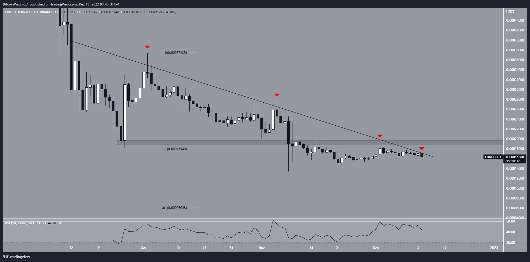 Le cours de la crypto LUNC décline sous une ligne de résistance descendante depuis le 12 septembre. Le mouvement de baisse a conduit à un creux de 0,00013 $ le 8 novembre. La ligne a jusque-là provoqué de nombreux rejets (flèches rouges), le plus récent remontant au 13 décembre.