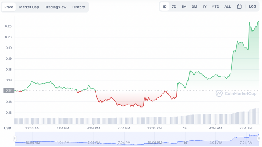 Peu après l’annonce de la nouvelle, le cours du DOGE a augmenté de 30% dans un premier temps, passant de 0,16 dollar à un sommet mensuel de 0,21 $. Depuis, le cours a légèrement baissé pour se situer juste en-dessous de 0,20 $, ce qui correspond désormais à une hausse de 20%.