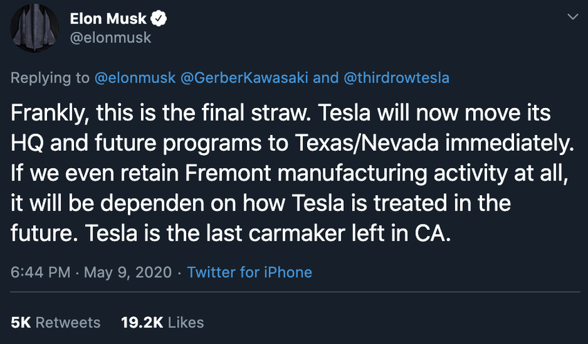 Il l’a appelé la «dernière goutte» dans un tweet de suivi. Il est maintenant prévu de déplacer le siège de Tesla et ses futurs programmes au Texas et au Nevada «immédiatement». Selon Musk, la relocalisation serait un coup dur pour le comté d’Alameda car il s’agit du dernier constructeur automobile de l’État.