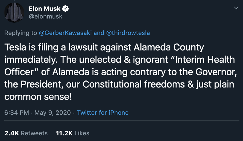 Le comté d’Alameda, en Californie, aura bientôt une action en justice déposée par Tesla. Son fondateur, Elon Musk, a annoncé le procès dans un récent tweet.