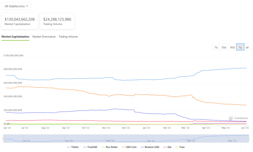 Selon les données de CoinGecko, la capitalisation boursière de Tether a augmenté d’environ 2 %. Ce, au cours des 30 derniers jours. Pendant ce temps, la plupart des grands stablecoins, notamment USD Coin, Binance USD, DAI et TrueUSD, ont accusé des pertes. Par exemple, la capitalisation boursière de l’USDC a chuté de 5 % en mai, tandis que le BUSD a perdu près de 16 % de sa market cap.