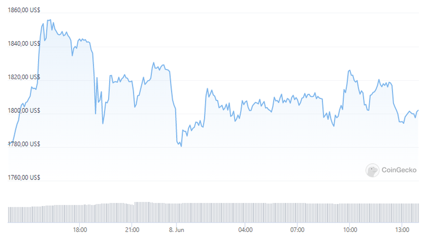 Malgré cette nouvelle de taille, le cours de l’ETH n’a pas enregistré de réaction majeure. Actuellement, l’actif se négocie à 1803,11 $, soit une hausse de 1% au cours des dernières 24 heures selon les données de CoinGecko.