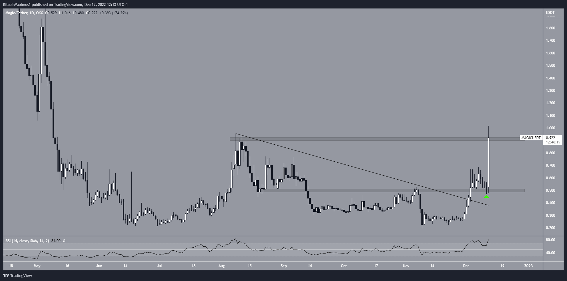 SponsoredLe 3 décembre, le cours de MAGIC a dépasé une ligne de résistance descendante. Cependant, son mouvement de hausse ne s’est accéléré que le 12 décembre. En effet, sa hausse s’est accrue lorsque que le cours a rebondi au niveau de la zone de support horizontale de 0,48 $, laquelle a précédemment agi en tant que résistance. Le même jour, le cours a atteint un sommet de 1,01 $, son niveau le plus élevé depuis le mois de mai, et nettement en-dessous de son sommet record (ATH, de l’anglais All Time High).