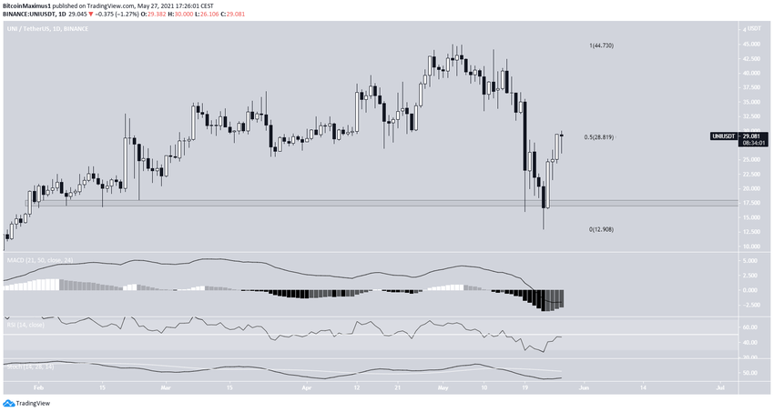 Uniswap (UNI) a rebondi à la zone de support de 17,50$ et a atteint le niveau de retracement de Fibonacci 0.5 à 29$.