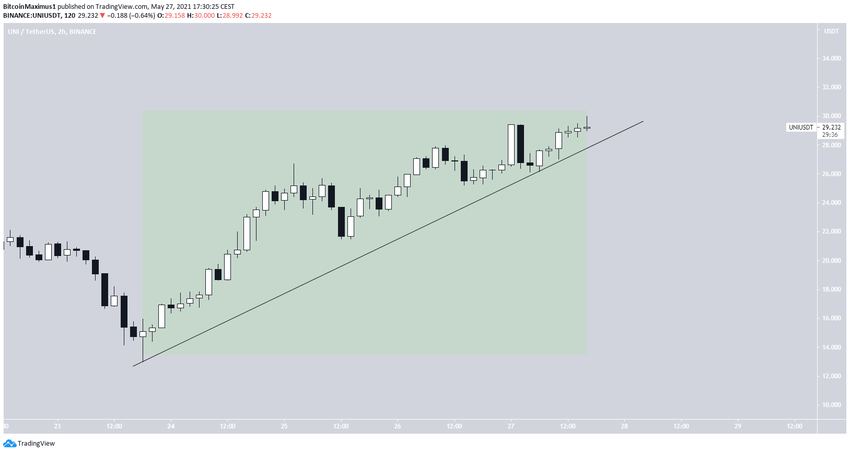 Le token du protocole DeFi Uniswap était en baisse depuis le 5 mai, date à laquelle il a atteint un cours record de 44,9 dollars. Le mouvement à la baisse a culminé le 23 mai avec un creux de 13 dollars. L’UNI est depuis en hausse.