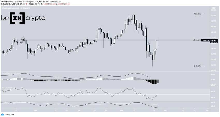 Une forte résistance se trouve à 34,1 dollars. Cette résistance est créée par le niveau de retracement de Fibonacci 0,5 et il s’agit également d’une zone de résistance horizontale. Actuellement, le LINK s’échange à l’intérieur de cette zone et ne l’a pas encore dépassée.