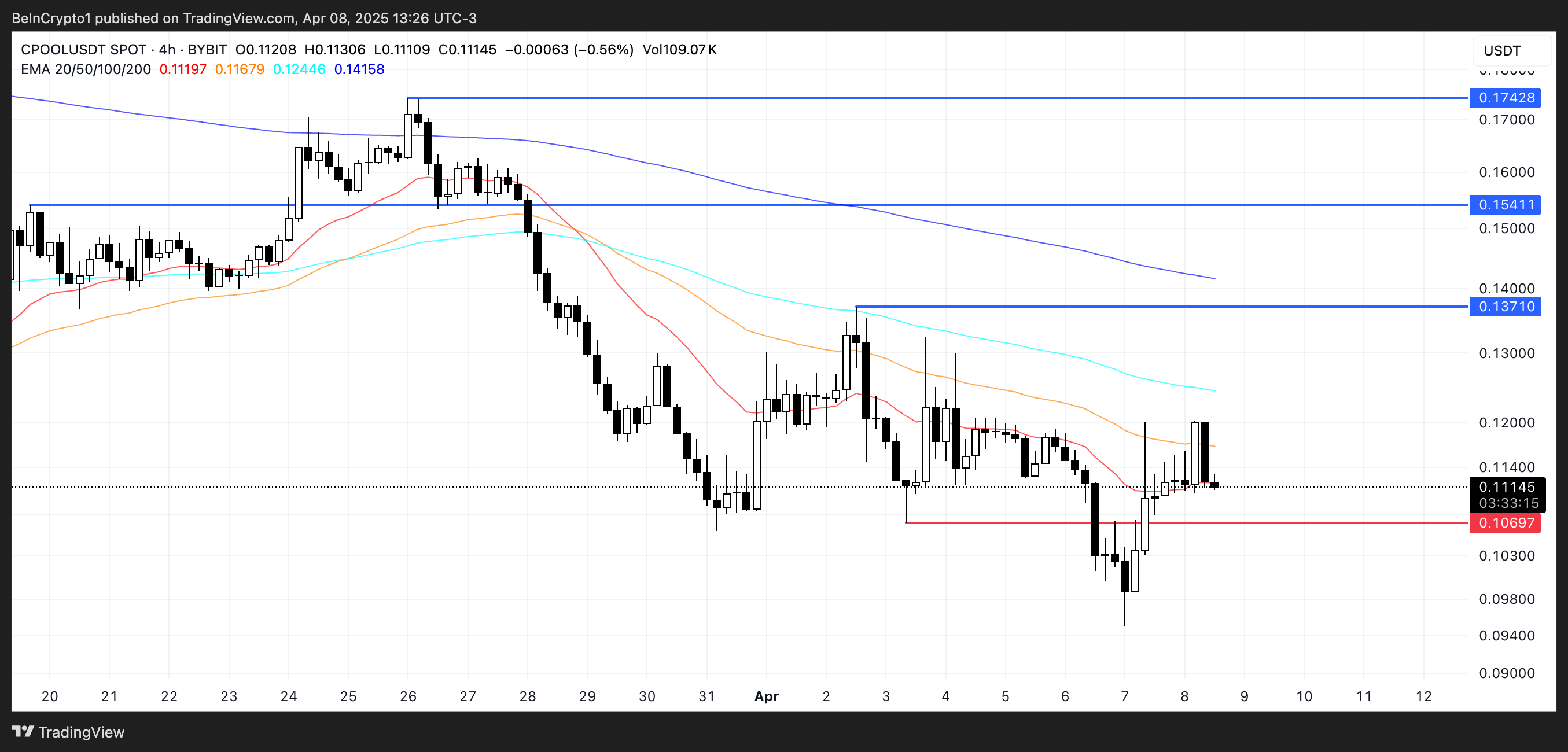 Si la correction actuelle se poursuit, le cours pourrait tester le support situé à 0,106 $ ; une rupture de ce niveau pourrait pousser CPOOL en dessous de 0,10 $. Il s’agit là d’un seuil psychologique majeur qui pourrait accroître le sentiment baissier envers ce token.