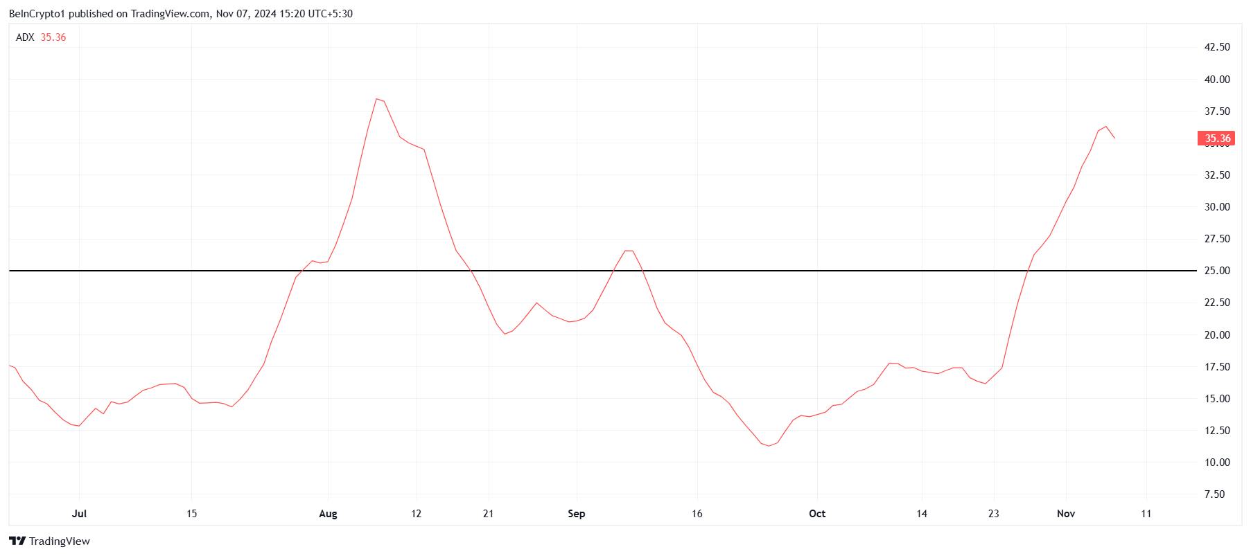 Le Momentum macro de Toncoin reflète également un sentiment baissier. Ce dernier est soutenu par des indicateurs techniques tels que l’Indice Directionnel Moyen (ADX), qui est actuellement à 33,0. Un ADX au-dessus du seuil de 25,0 signale généralement une tendance forte. Etant donné que la tendance actuelle du TON est à la baisse, cela n’augure rien de bon pour son évolution à court terme.