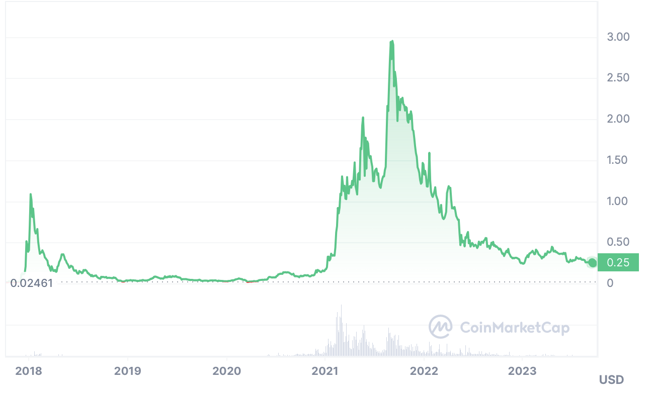 Le concurrent de l’Ethereum n’a pas connu une bonne année en bourse. Selon les données de Coinmarketcap, le 📉 cours de l’ADA a chuté de 0,23% en rythme annuel, tandis que le Bitcoin a déjà augmenté de près de 60% cette année. Cette sous-performance est préoccupante pour l’ADA, car son cours avait fortement baissé lors du marché baissier des cryptomonnaies en 2022. Actuellement, le prix de Cardano est de 0,2489$, ce qui représente une baisse de 91,93% par rapport à son sommet de septembre 2021, à 3,09$.
