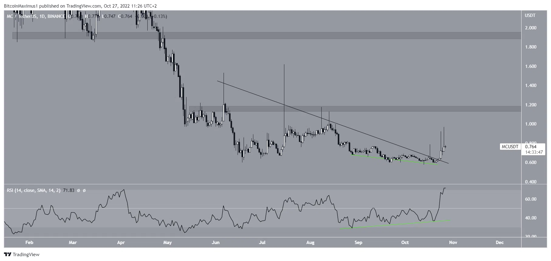 Merit Circle est le dernier de notre top 5 des altcoins à surveiller en novembre 2022. Le cours du MC était en baisse sous une ligne de résistance descendante depuis le 6 juin. Après que le RSI journalier ait généré une divergence haussière, l’actif a finalement réussi à dépasser cette résistance le 23 octobre. Ensuite, il a initié un mouvement de hausse très rapide mais n’a pas réussi à le maintenir, créant une longue mèche supérieure.