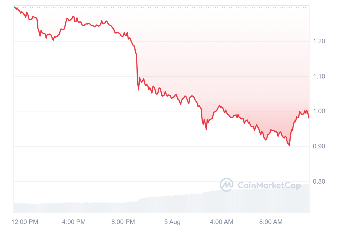 SponsoredLe cours du LDO réalise la pire performance de la journée avec une chute de 23,71 % sur les dernières 24 heures. Au moment d’écrire ces lignes, le jeton perd de la hauteur avec un retracement jusqu’à 0,99 $. Cela faisait bien longtemps que l’on avait pas vu un LDO sous le dollar.
