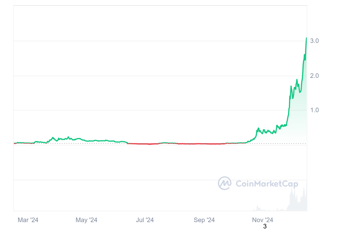 On peut dire qu’il y a de la variété au sein de ce top avec un meme coin, une crypto RWA et maintenant une crypto IA. Les trois performances ont été impressionnantes, et la troisième place du podium est occupée par VIRTUAL et ses 6 084 % de hausse. Les gains ont donc été au rendez-vous et pourraient se poursuivre l’année prochaine. En effet, puisque c’est surtout en fin d’année que le prix de VIRTUAL a explosé.