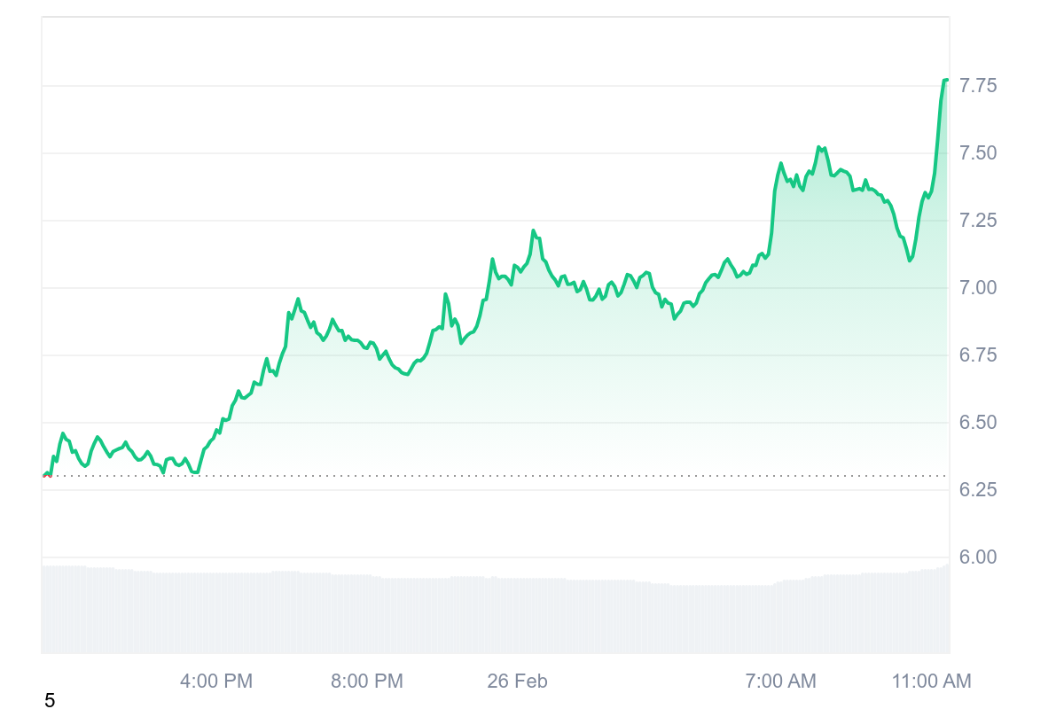 La crypto BERA, native de la blockchain Berachain retrouve le chemin de la hausse avec une hausse significative de 23,99 %. Désormais, la pièce se négocie à 7,76 $.