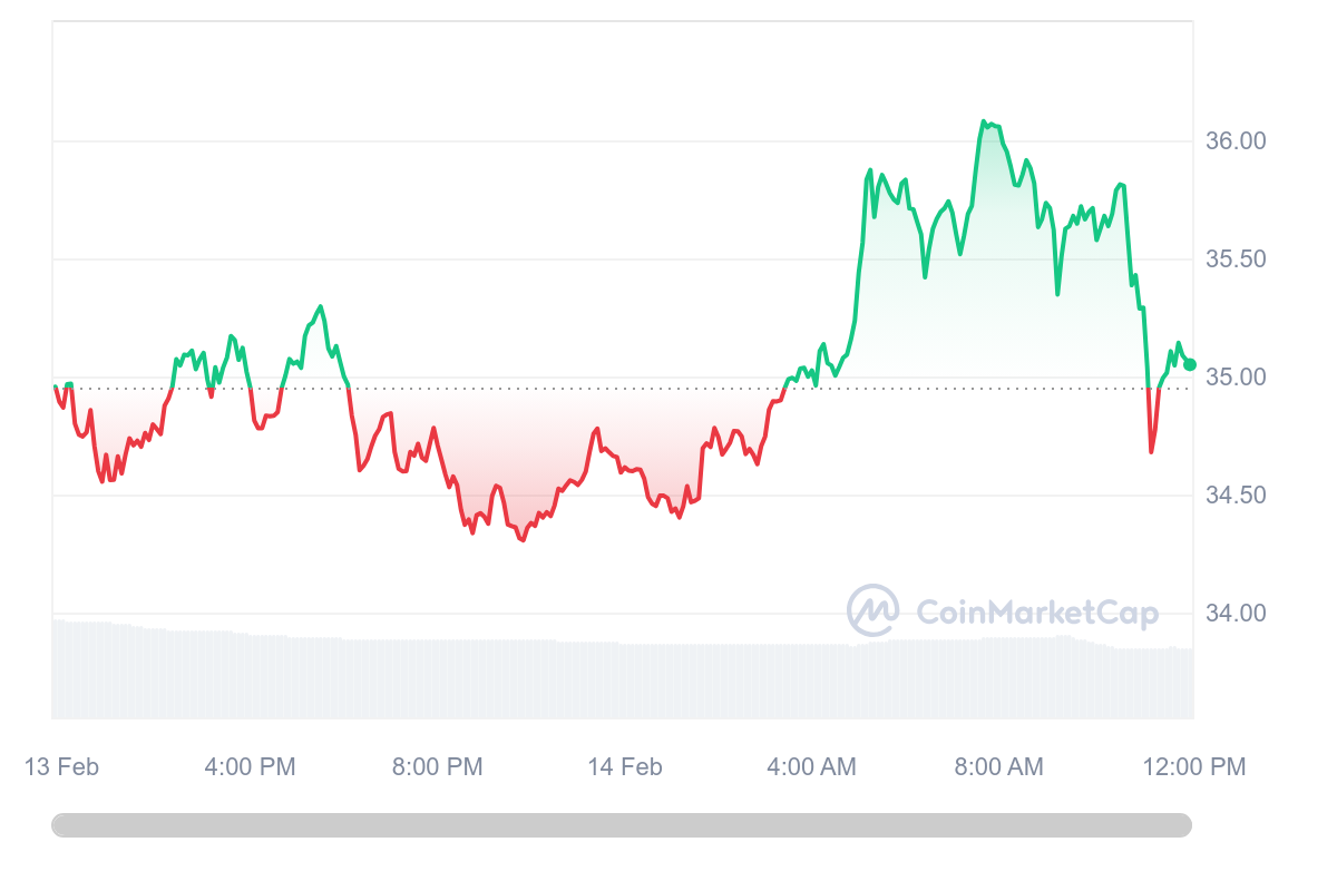 Toutefois, le cours INJ n’est pas non plus dans une situation problématique, car il intègre le top & flop crypto du jour avec une hausse et pas une baisse. Au final, le jeton gagne 0,53 % et s’échange désormais à 35,05 $.