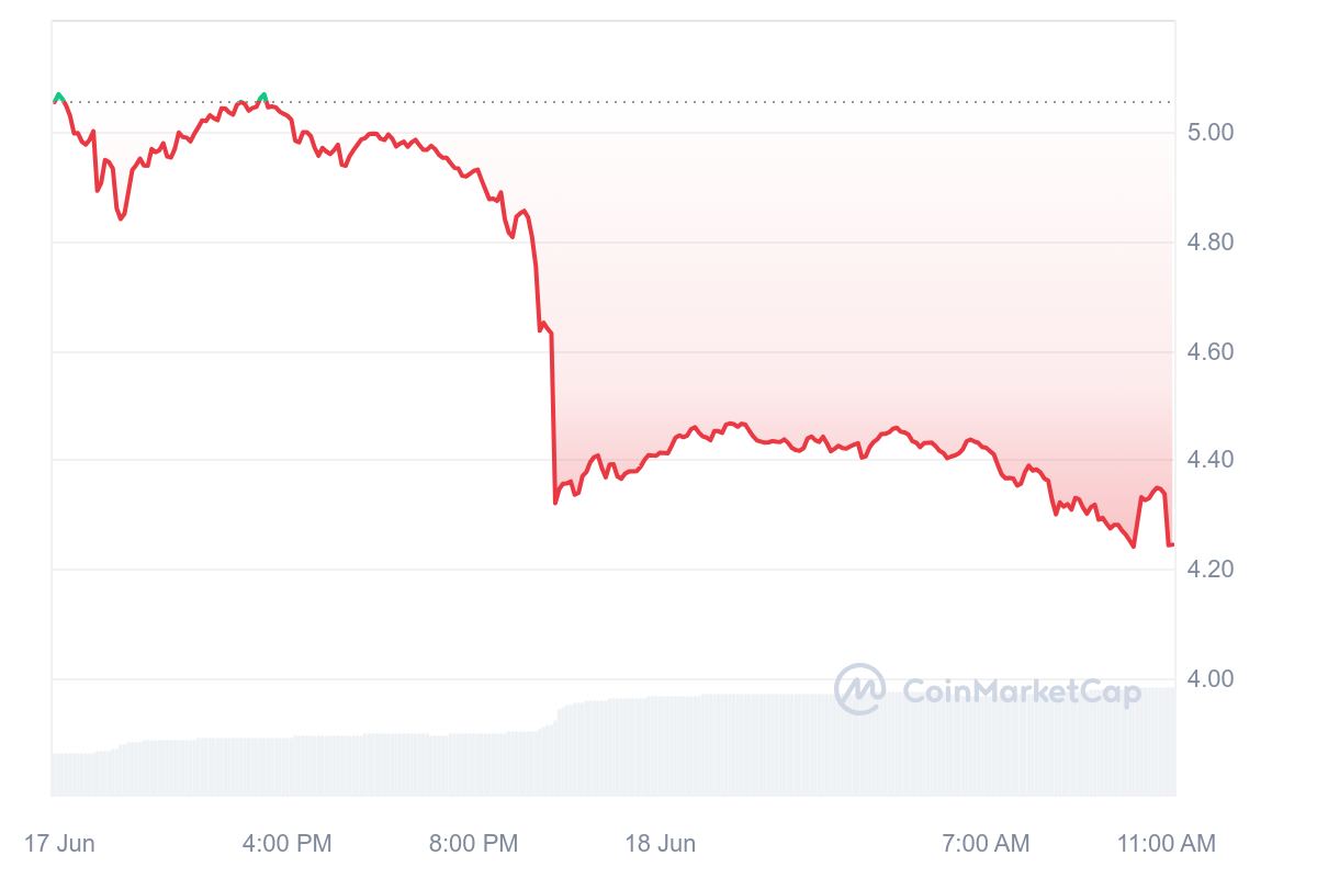 Malgré le même léger rebond en amont du top & flop crypto que le FTM, c’est finalement pour mieux chuter qu’a été faite cette performance. Au final ça chiffre, avec plus de 15 % en moins et un prix qui retombe à 4,24 $.