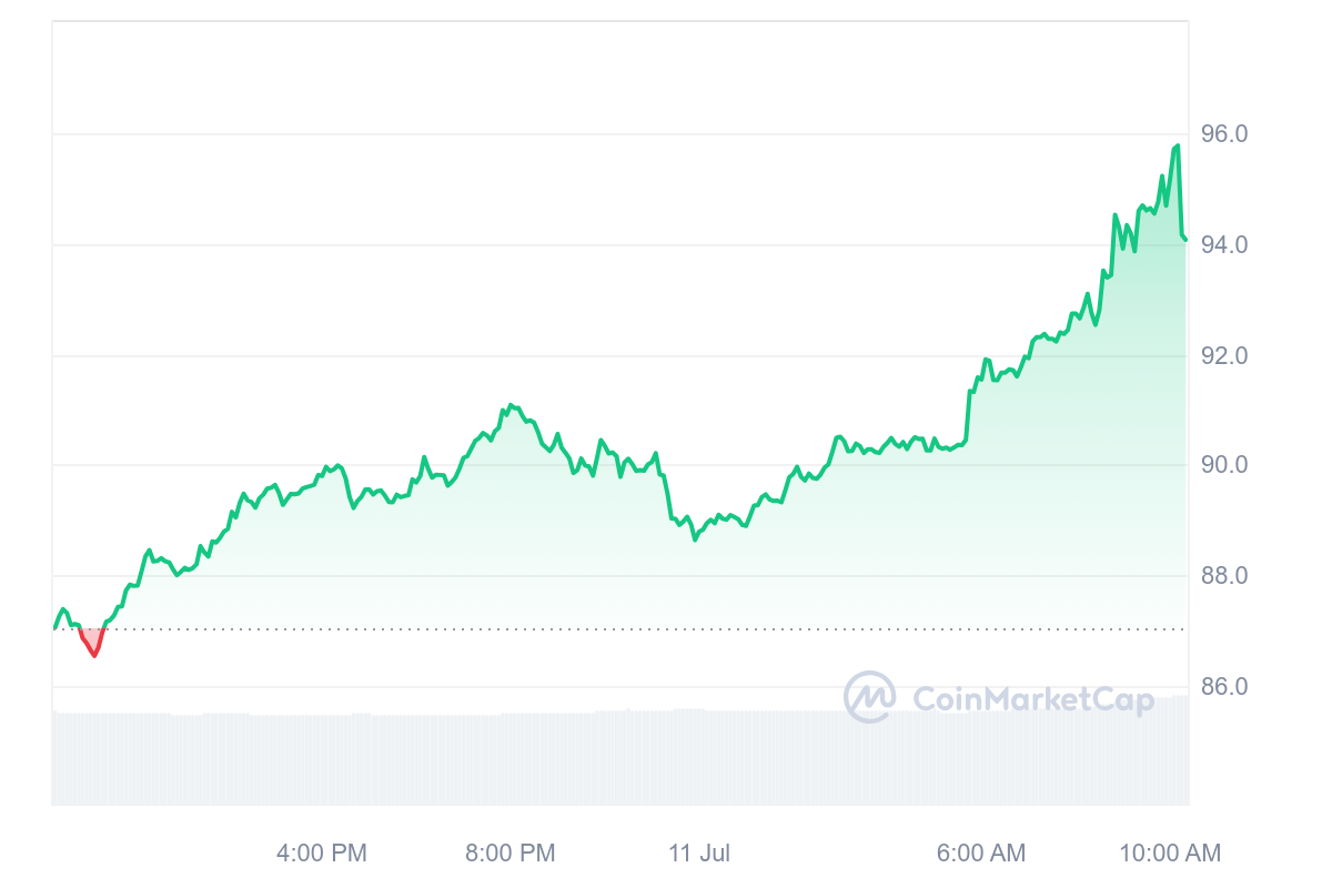 Sur la journée, le cours d’AAVE a foncé vers les 100 $ mais il s’est malheureusement arrêté avant. Avec une hausse toutefois conséquente de 8 %, le jeton se valorise maintenant à 94,07 $.
