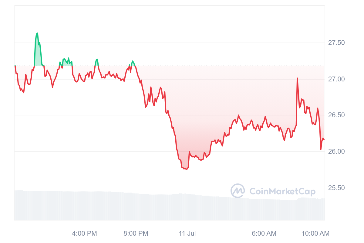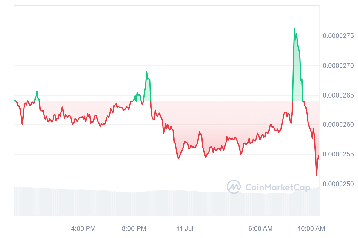 Malheureusement, cet affrontement s’est soldé par une victoire de la baisse qui est venu mettre en pagaille le cours du BONK. Malgré tout, la baisse est légèrement contrôlée, avec une perte de 3,35 % et un prix qui reste aux alentours des 0,000025 $.