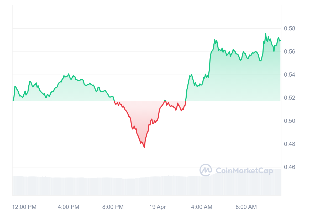 Au moment de rédaction, le jeton SEI rate de peu la hausse de 10 % et se “contentera” de 9,60 % de gains pour le moment. Malgré tout, c’est une très belle évolution journalière qui permet au prix de l’actif d’atteindre les 0,57 $.