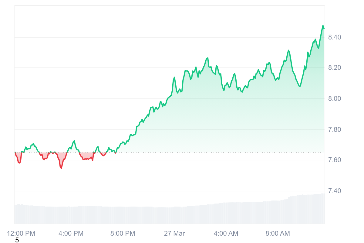Le cours du BERA a fière allure, donc, avec une hausse progressive qui s’est même intensifiée en fin de journée. Au total, le résultat est impressionnant, puisque la pièce de Berachain gagne 10,51 % afin de se rapprocher des 8,50 $.