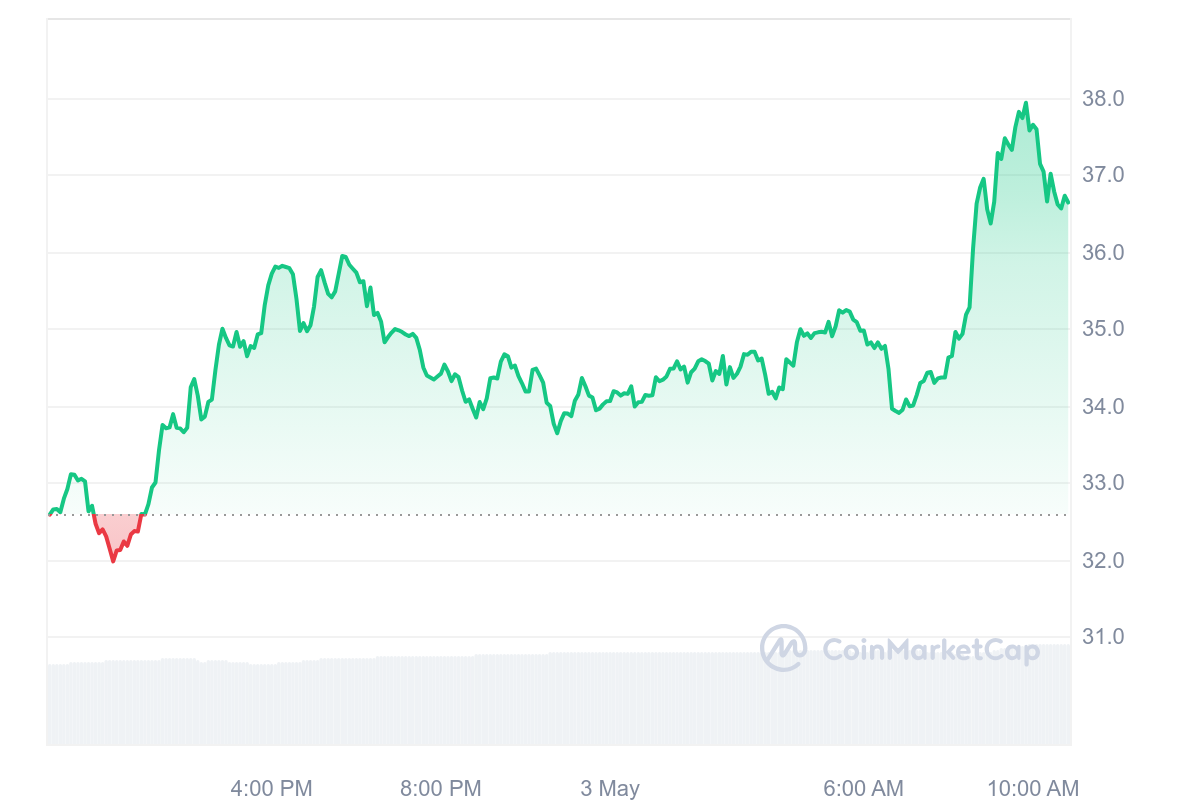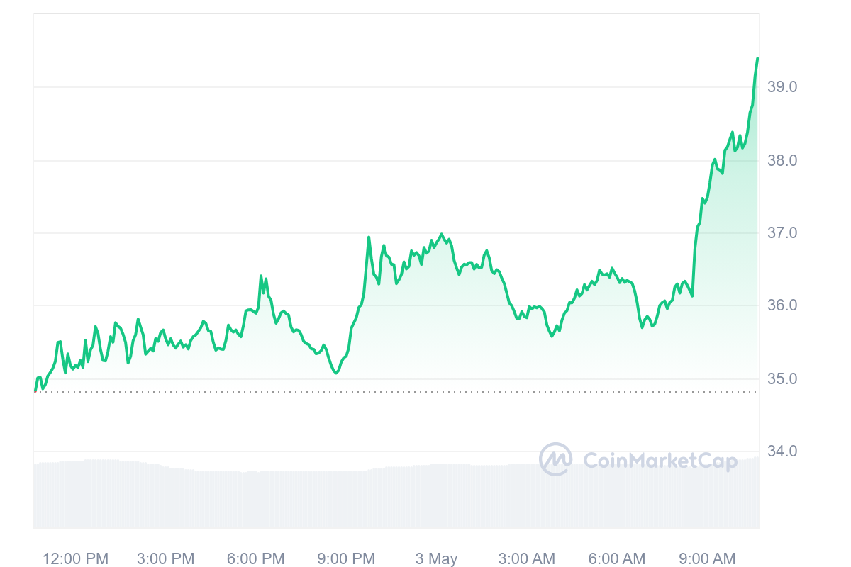 Ainsi, le cours AR est en forte hausse avec un gain qui se rapproche fortement de celui d’ORDI. A l’heure actuelle, AR a gagné 12,44 % et s’échange à 36,63 $ sur les marchés crypto.