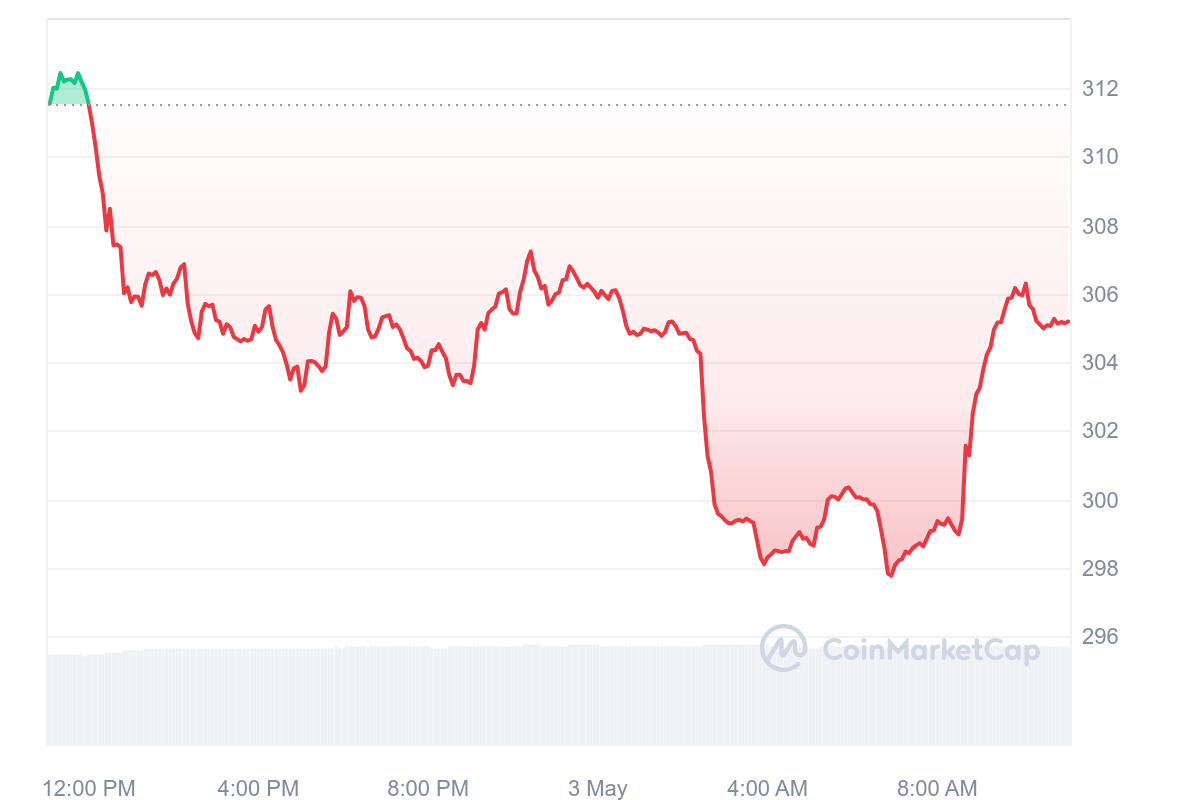 Au moment de rédaction, le GNO flirte peut-être un peu trop avec les 300 $ mais arrive tout de même à rester au-dessus. Au moment de rédaction, le retracement de 2,09 % fait suivre un à-coup au prix du token.