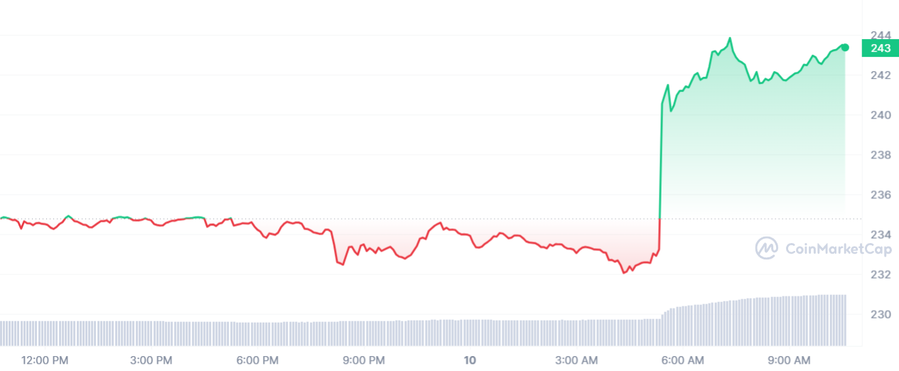 Le cours BNB est finalement en hausse de 3,67 % sur les dernières 24 heures. En conséquence, chaque pièce native de l’exchange crypto Binance a un prix d’échange de 243,40 $.