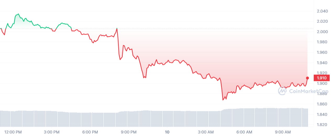Avec cette nouvelle évolution négative, le cours 🐒 APE est fortement teinté de rouge. Une teinture dont il est difficile de se défaire. En ayant perdu 4,80 %, ApeCoin s’échange à 1,90 $. Une nouvelle hémorragie qui ne fait que débuter ?