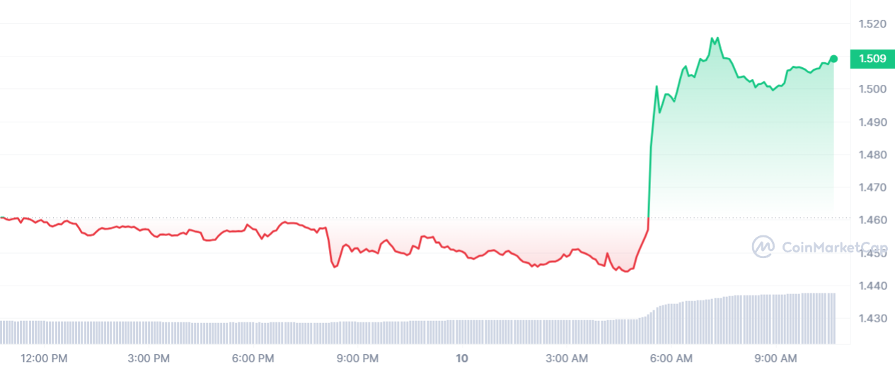Aujourd’hui, le 🎂 CAKE a vu son cours gagner 3,29 %. Ainsi, la pièce de PancakeSwap s’échange à 1,51 $.