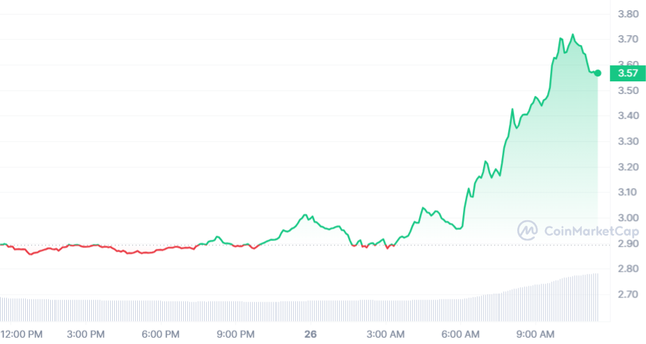 En effet, puisque le cours CAKE est une nouvelle fois en forte hausse, et dépasse en un clin d’œil les 3,50 $. Après avoir temporairement dépassé les 3,70 $, la pièce de PancakeSwap, en hausse de 23,56 % sur la journée s’échange à 3,57 $. Voilà un beau premier pour bien clôturer noël 2023. Les vœux des adeptes de la crypto semblent avoir été écoutés… et exhaussés.