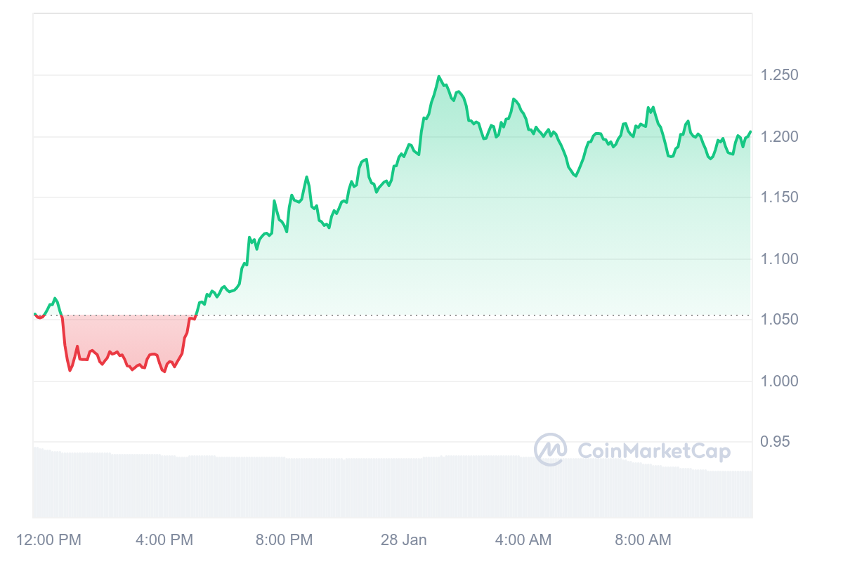 Jupiter (JUP) avait fort bien commencé sa journée et a su maintenir le rythme jusqu’à la fin de journée. Les gains sont au final de 14 % avec un prix d’échange de 1,20 $.
