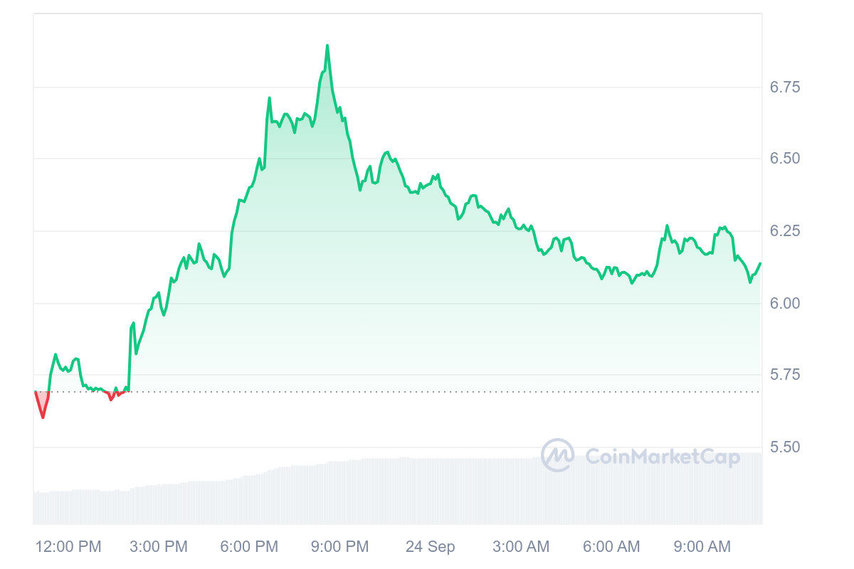 En effet, puisque le jeton était valorisé à 6,75 $ et il est malheureusement retombé à 6,14 $. Malgré tout, sur les dernières 24 heures, la hausse est quand même de 8,72 % pour le TIA de Celestia.