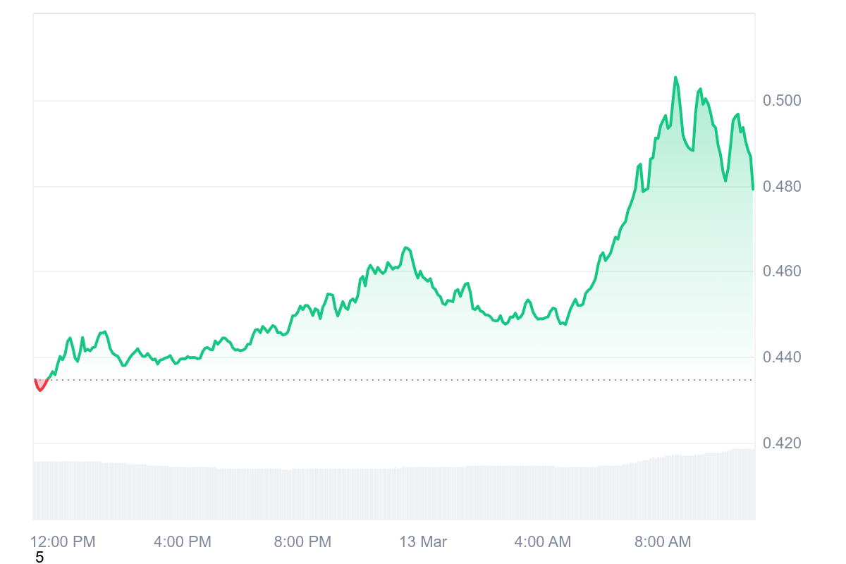 Le graphique parle pour lui même avec un gain journalier impressionnant puisque le S est lui aussi au-dessus des 10 % avec des gains de 10,87 %. La pièce native de Sonic s’échange désormais à 0,479 $, malgré les légères pertes de fin de journée.