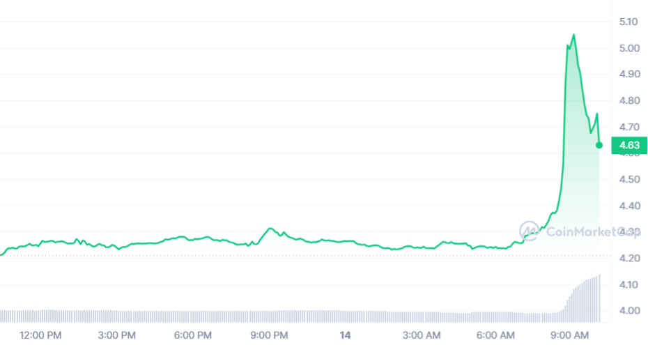 Subitement sorti de l’ennui, le cours AXS a momentanément dépassé les 20 %. Cependant, au moment de rédaction, le projet Axie Infinity est déjà en train de reperdre l’ensemble de ses gains. Après avoir dépassé les 5 $, l’actif a chuté jusqu’au niveau de 4,63 $. Malgré tout, la hausse est toujours impressionnante, puisqu’elle est de +13 %.