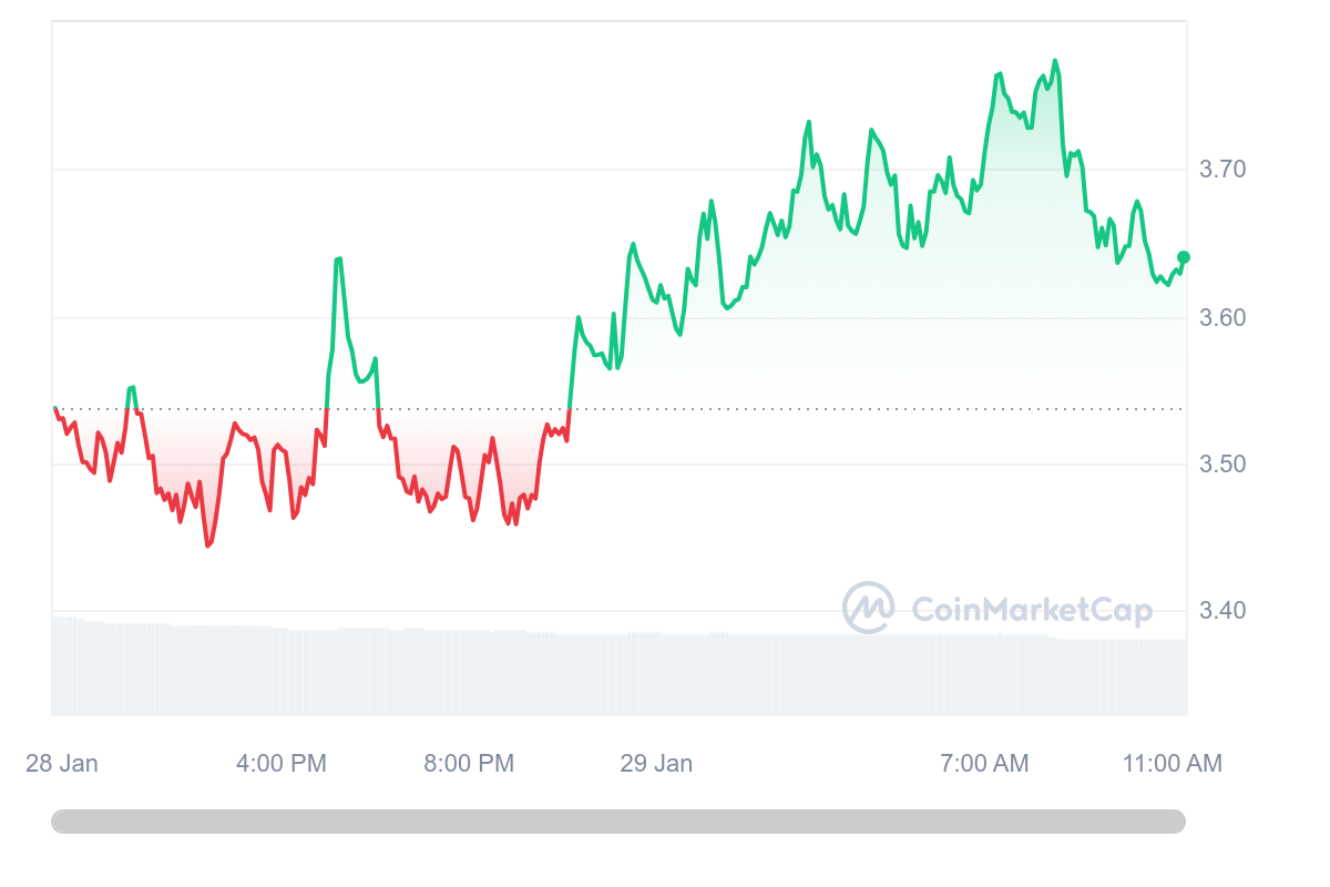Une fois de plus dans le vert, le cours du MANTA est dorénavant de 3,64 %. La hausse s’est finalement réduire au cours de l’après-midi, puisque la pièce est légèrement retombée.