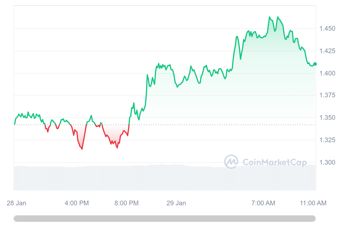 Le cours du SUI arrive donc à se maintenir au-dessus des 1,40 $ au moment d’écrire ces lignes, et cherchera à aller plus haut. Pour le moment, la pièce a gagné 4,59 % sur la journée.