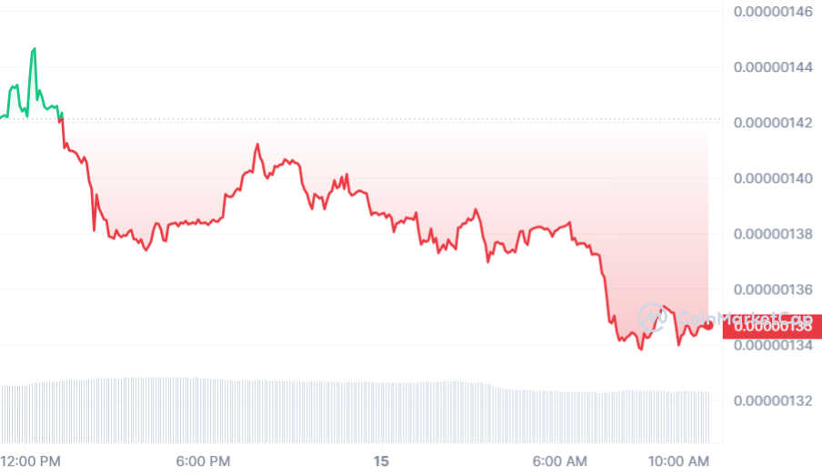 Le cours PEPE est en baisse de 5,35 % sur les dernières heures et s’échange maintenant à 0,00000134 $.