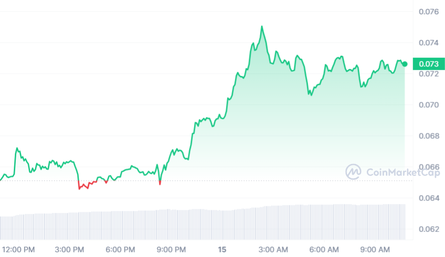 Le cours HBAR est en hausse de 11,36 % et reste le seul altcoin (hormis SEI) à dépasser les 10 % de hausse. Au moment de rédaction, la pièce s’échange à 0,073 $.