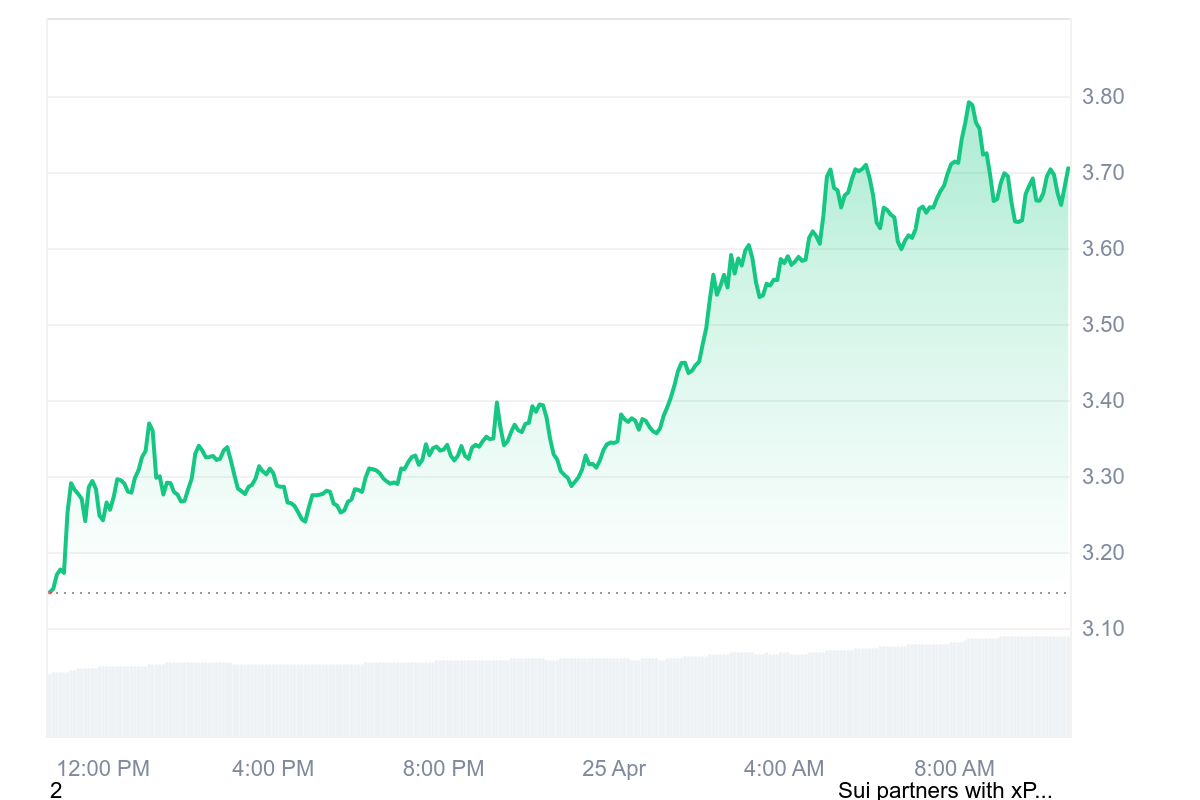 Le jeton est donc bien loin de déroger à la règle de la hausse et pourrait même s’en aller en week-end avec les 4 $ en poche ! La pièce SUI se négocie à 3,70 $ après ce gain de 17,56 %.