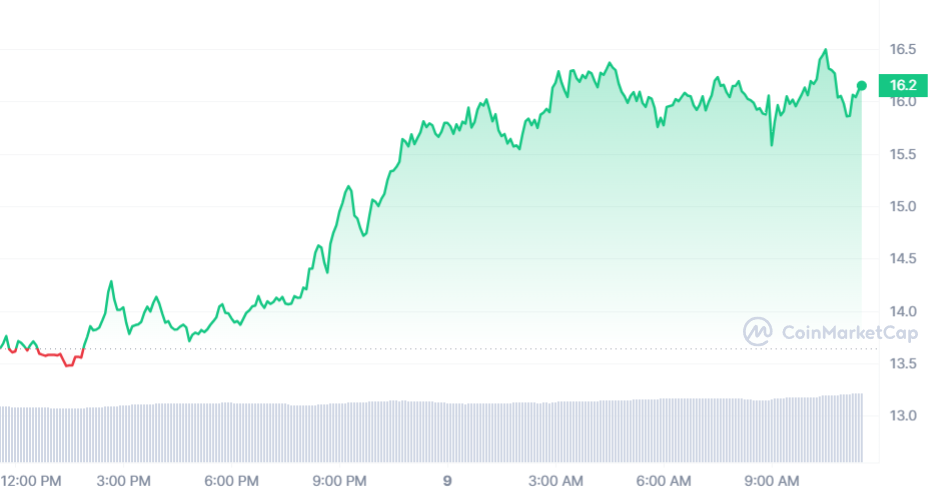 Avec ce (très) grand bond en avant, Celestia se rapproche à un dollar de son ATH de la semaine dernière. Le TIA aurait-il des idées derrière la tête ? La hausse du jour de 18,29 % et un prix à 16,20 $ semblent montrer que oui.