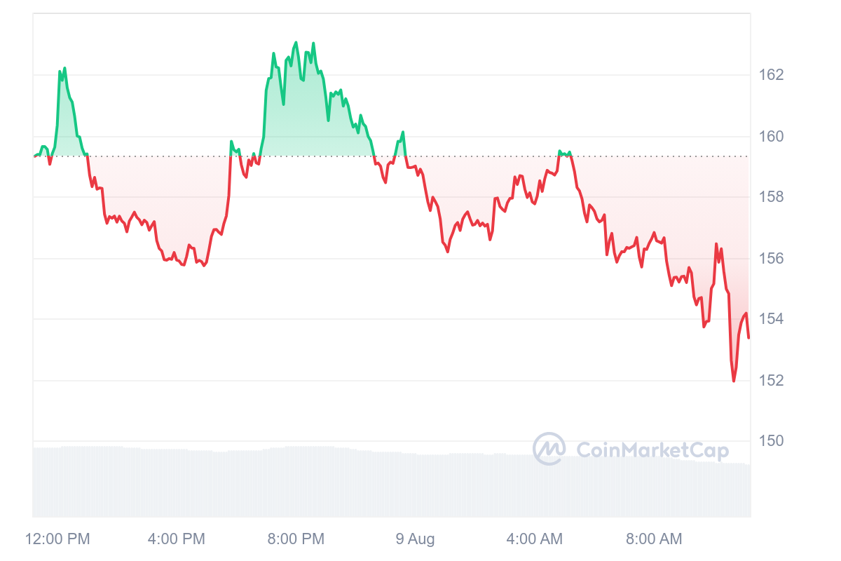 Sur la journée, le constat est négatif avec une baisse de 3,85 %. En conséquence, le jeton arrive à se maintenir au-dessus des 150 $ mais devrait essayer de dépasser les 160 $ dès que possible.