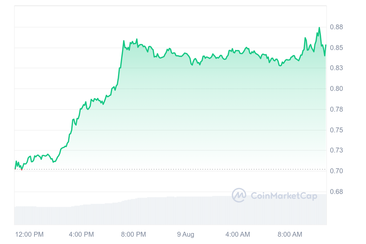 Sur les dernières 24 heures, le SUI est en grosse forme, avec un début de journée explosif qui se concrétise par du vert et du vert chiffré à 22,28 %. Le SUI est disponible sur le marché à un prix de 0,85 $.