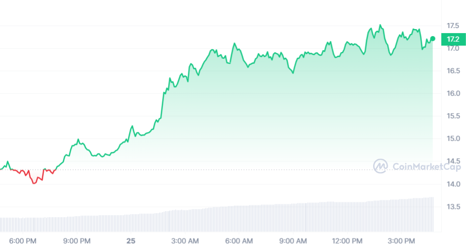 Parfois, l’écart est impressionnant entre le premier et le troisième, mais ce n’est pas le cas aujourd’hui. En effet, car Internet Computer (ICP) a des allures de premier avec un gain de 19,60 % sur 24 heures. En conséquence, le jeton vaut 17,32 $.
