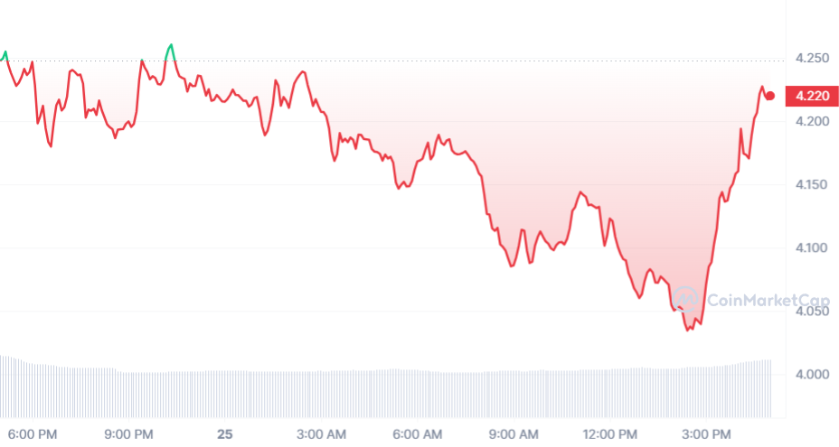 En 24 heures, Ronin s’est plutôt fait discret avec une perte de 0,84 %. Désormais, le cours du jeton est de 4,21 $.