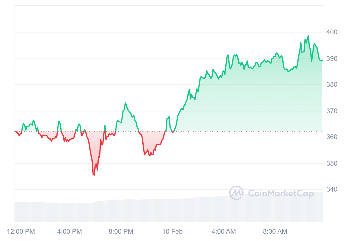 TAO de Bittensor intègre cette liste des privilégiés avec une hausse journalière de 7,45 %. Le prix du TAO remonte enfin et se rapproche maintenant des 400 $.