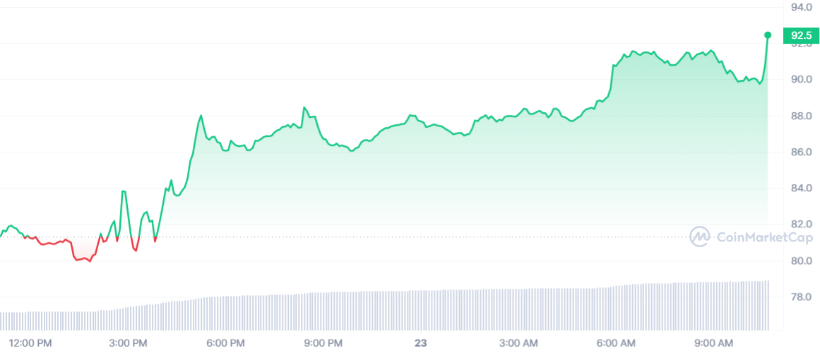Le cours LTC est en hausse sur les dernières 24 heures. Avec 13,40 % de hausse, le jeton réalise la meilleure performance de la journée. Une performance exceptionnelle alors même que Bitcoin a coincé au même moment. Au moment de rédaction, le cours LTC est toujours en hausse, peut être une soirée très agitée en vue. La crypto s’échange désormais à 92,55 $. Les 100 $ sont après tout peut-être un objectif pour très bientôt !