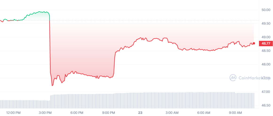 Ainsi, le cours RPL est seulement en baisse de 1,67 % sur la journée. Rien d’impressionnant, mais suffisant pour réaliser la pire performance de la journée. Le prix d’échange de chaque jeton est de 48,77 $.