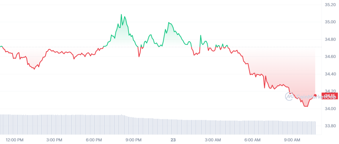 Avec sa baisse de 1,59 % sur la journée, le cours BSV est devancé d’un cheveu par le RPL. Chaque jeton Bitcoin SV a désormais un prix de 34,16 $.